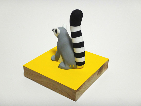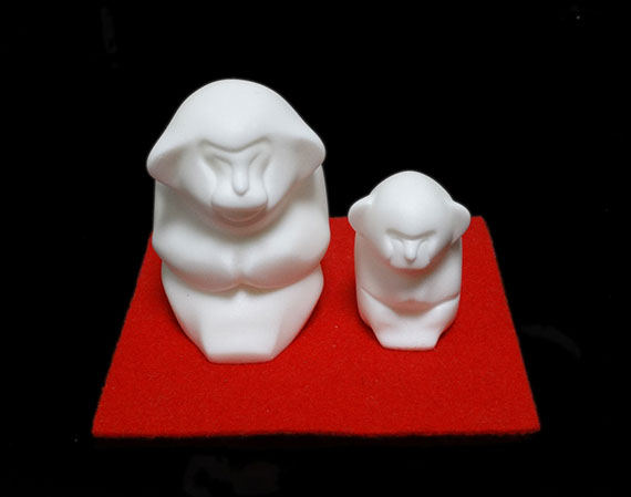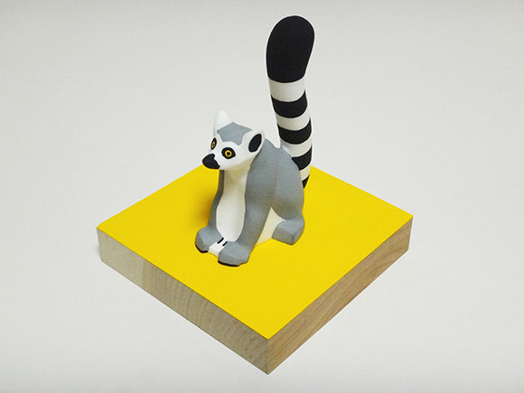 大きなまん丸オサルと、一回り小さいちょこんと座ったオサルのセットと、ひょろりと伸ばしたしっぽが印象的なワオキツネザルです。