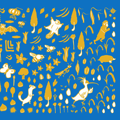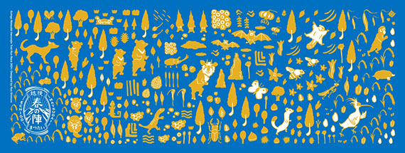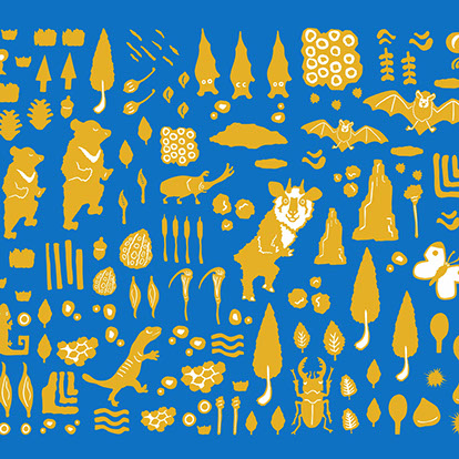 新潟に住む動物や昆虫達をメインに、自然いっぱいの森の中で開催されるトレイルランレースをイメージして一つ一つの絵柄を描いてからハンコを彫り図版を製作しました。