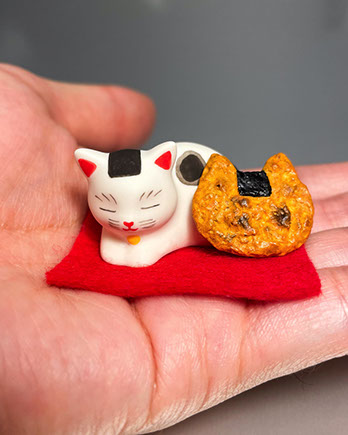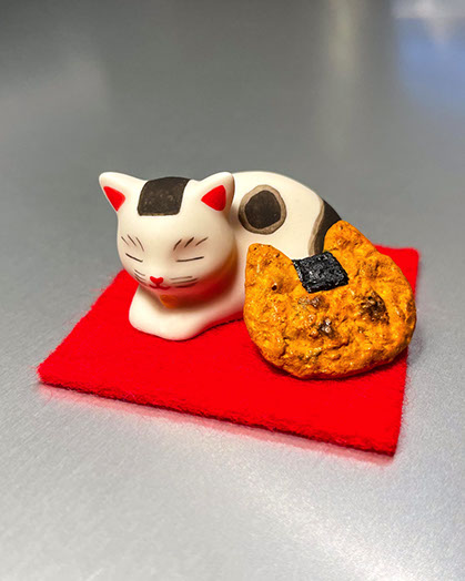 パッケージイラストをモチーフにした「のり猫とお煎餅」の小さなオブジェを手がけました。