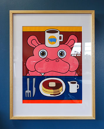 カフェタイムを満喫するカバさんの絵です。